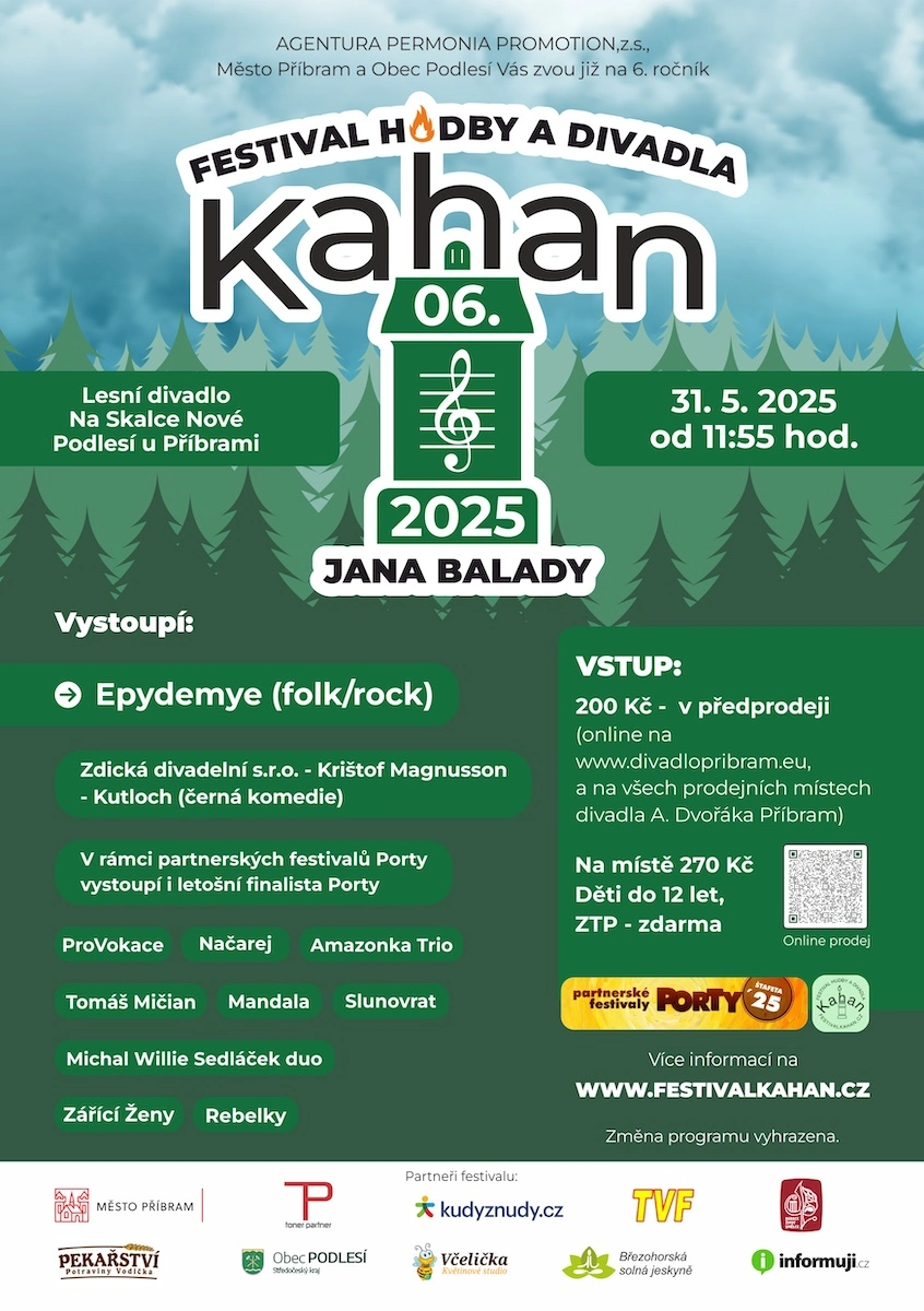 Druhou zastávkou Štafety partnerských festivalů Porty (ŠPFP) se letos stane 6. ročník Festivalu hudby a divadla KAHAN Jana Balady v lesním divadle Na Skalce v Novém Podlesí. Festival své brány otevře návštěvníkům v sobotu 31. května 2025. Právě o tomto festivalu si bude Stopař ePortýra povídat s Václavem Knechtlem z pořádající Agentury PERMONIA PROMOTION z.s.
